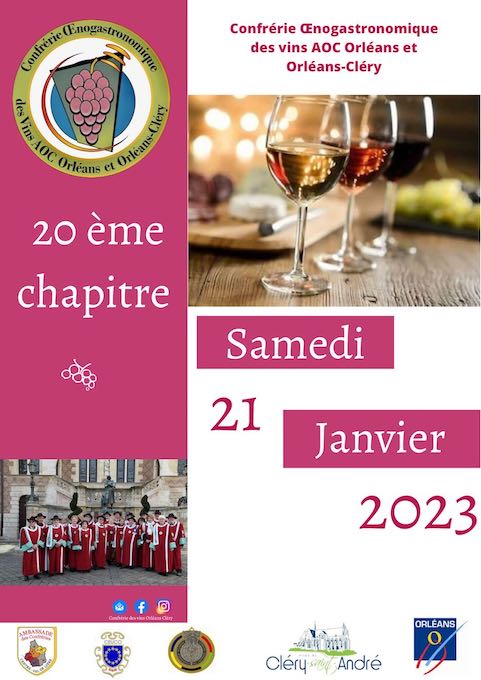 Après deux années d’interruption Covid, la Confrérie Œnogastronomique des Vins AOC Orléans et AOC Orléans-Cléry, créée en 2002, a tenu son 20ème chapitre à l’auditorium du musée des Beaux-Arts d’Orléans en présence du Grand Échevin de la Confrérie M. Serge Grouard, Maire d’Orléans, Président de la Métropole – de M. Gérard Corgnac, Maire de Cléry-Saint-André, et de nombreuses autres personnalités.