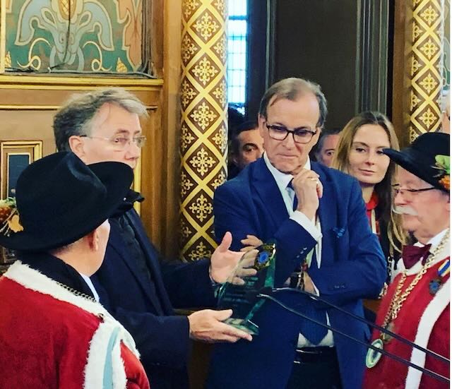 Le Grand Maistre honoraire a remis au nom de M. Carlos Martin-Cosme, Président du Conseil Européen des Confréries Œnogastronomiques (CEUCO) à M. Serge Grouard le Grand Prix “Aurum 2022 ” de la Culture-Gastronomie attribué au Festival de Loire d’Orléans.